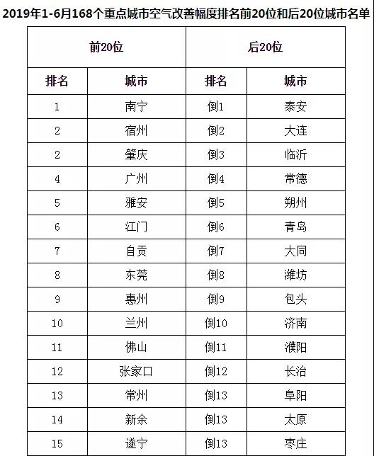 從空氣質量同比改善程度看,2019年1-6月,168個重點城市中南寧、宿州、肇慶市等20個城市空氣質量改善幅度相對較好(從第1名到并列第19名);泰安、大連、臨沂市等20個城市空氣質量改善幅度相對較差(從倒數第1名到倒數第20名,見附表3)。