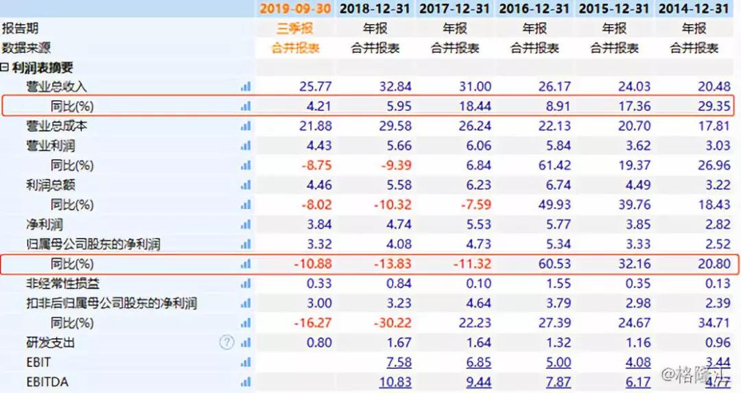 根據財報披露,2019年前三季度公司實現營業收入25.77億元,同比增長4.21%,歸母凈利潤3.32億元,同比下降10.88%,值得一提的是,公司近三年的凈利潤增速一直處于下滑的狀態。